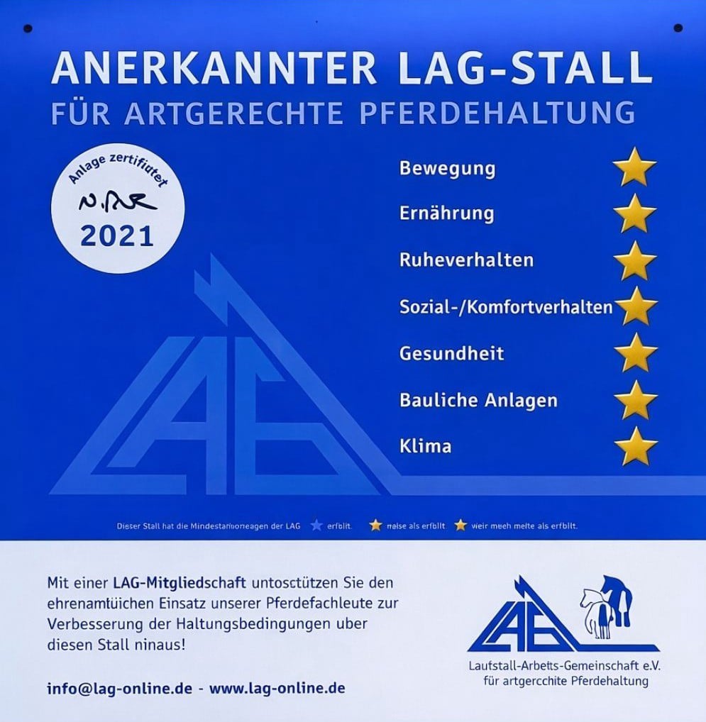 Unsere Anlage wurde von der Laufstall-Arbeits-Gemeinschaft e. V. mit sieben Sternen zertifiziert – ein sichtbares Zeichen gelebter Qualität.
